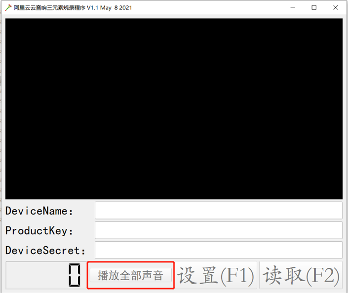 当“文件”进度条完成后,则说明文件下载完成,此时重启设备后,打开4.2章节中的“2.通过USB手动设置阿里云三元素.exe”,重新连接设备USB到电脑上,点击“播放全部声音”,如下图所示: