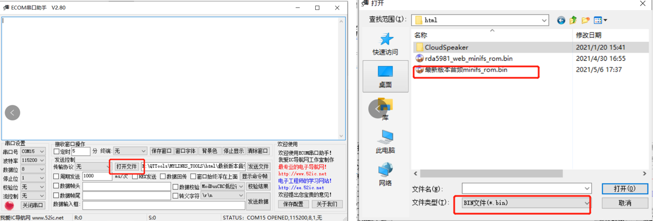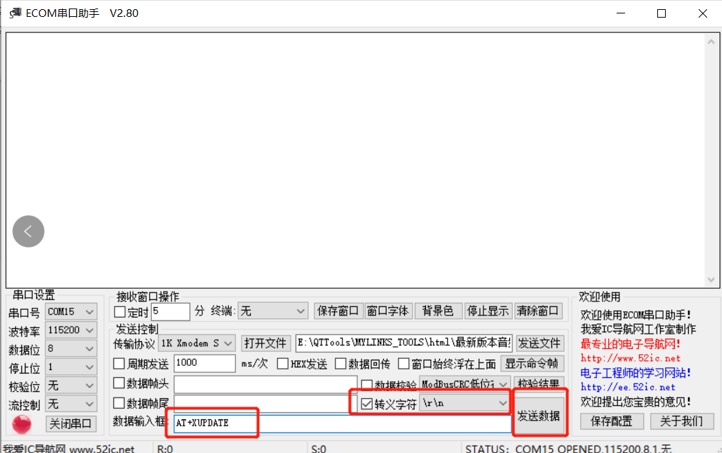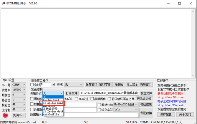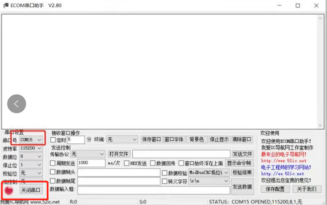 3.打开“ECOM串口助手 V2.80.exe”,选择端口为COM15,并点击打开: