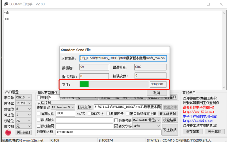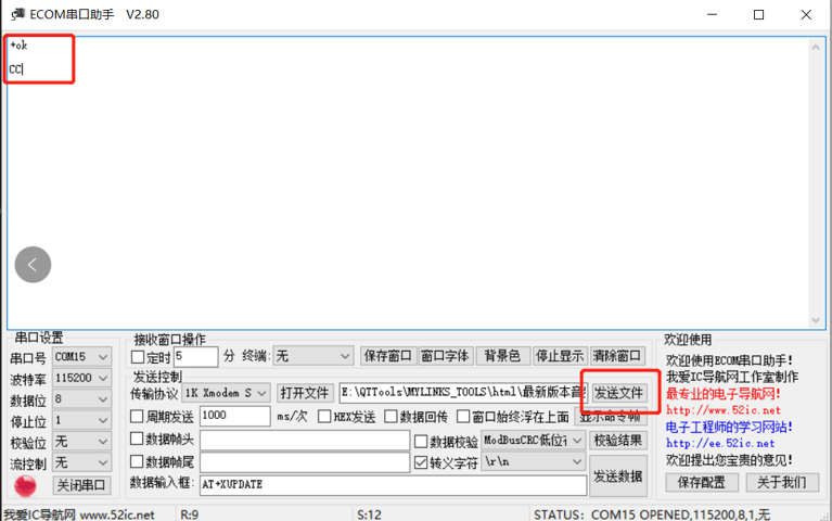 此时“ECOM串口助手 V2.80.exe”将返回+ok后连续输出C的字符,请在C出现后未出现其它乱码字符后立刻点击“发送文件”,否则可能会出现下载未相应的问题。