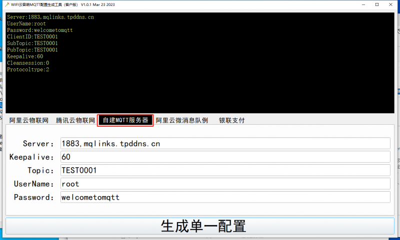 点击打开“7.MQTTConfigTools(WIFI客户版).exe”,将服务器参数:server参数、keepalive、topic、MQTT服务器地登录名及密码填进应用程序中,并点击“生成单一配置”即可。这里我们测试将设备连接到我们测试MQTT服务器,域名地址为info.mqlinks.top,端口为1883,所以在设置中Server中填写1883, info.mqlinks.top。(注意:请不要输入引号和逗号部分等数据),如下图所示: