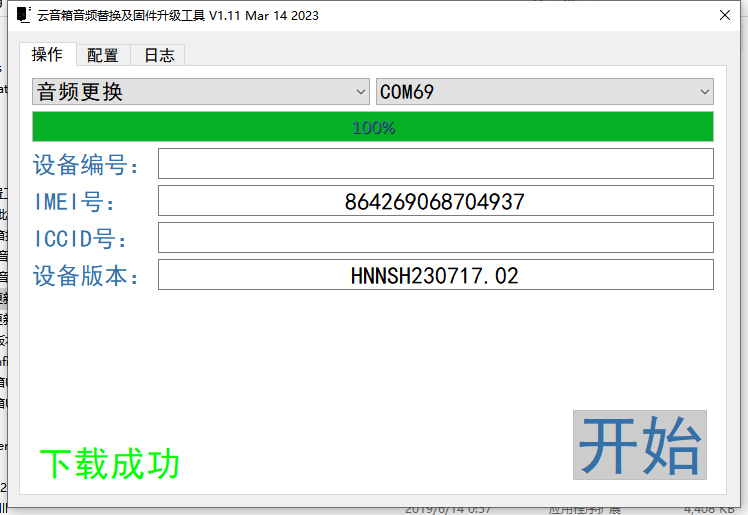 设备开机,使用数据线与电脑连接,此时软件界面,自动识别更新音频COM口,点击开始,等待音频更新完成。