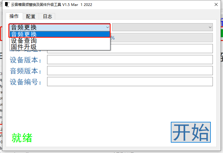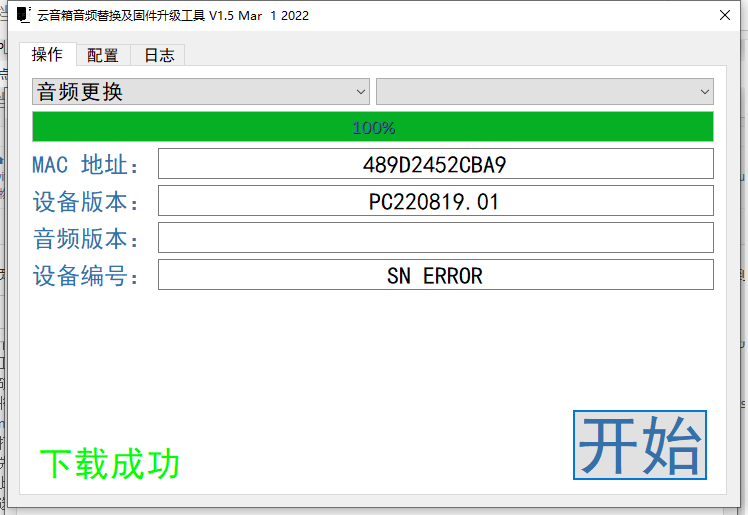 长按音量减,设备提示AP配网后,连接到电脑,识别到设备后(出线COM口即为识别成功),点击开始,等待音频更新完成