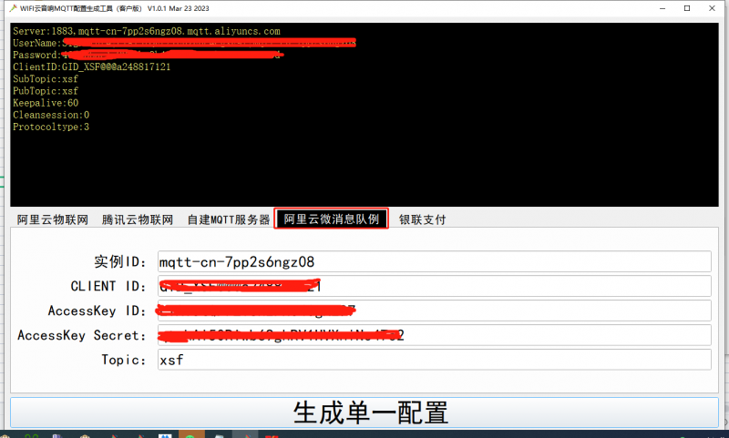 点击打开“7.MQTTConfigTools(WIFI客户版).exe”,将获取的参数填进应用程序中,并点击“生成单一配置”即可,如下图所示:(注意:请不要输入引号和逗号部分等数据)