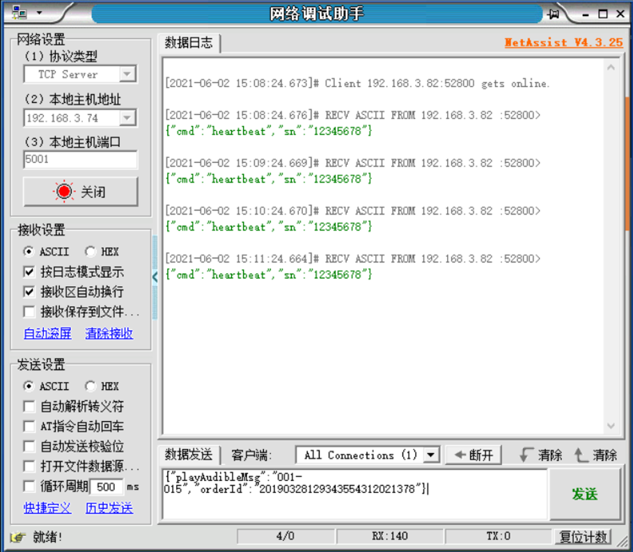 服务器向设备发送协议:{“cmd”:“heartbeat”}时,设备在连接上服务器后第一次收到此数据后会发出一声“服务器连接成功”,之后不会再发出此种提示,至到设备从服务器断开后再次连接上服务器后第一次收到此数据,才会出现提示。