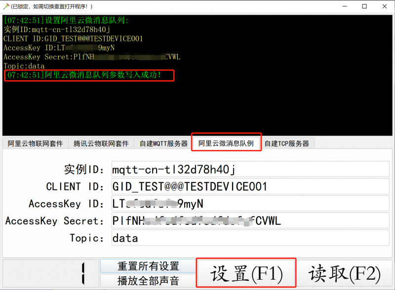 将设备通过USB数据线与电脑连接。打开“7.通过USB手动设置阿里云微消息队列.exe”,将实例ID、CLIENT ID、AccessKey ID、AccessKey Secret及Topic设置进入设备。