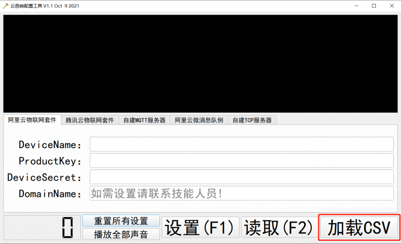 2. 打开CloudeSpeakerConfig中的“1.通过USB加截CSV批量烧写阿里云三元素.exe”,如下载所示:
