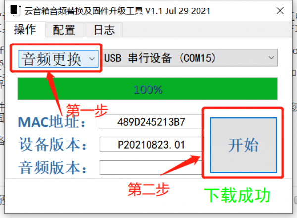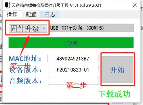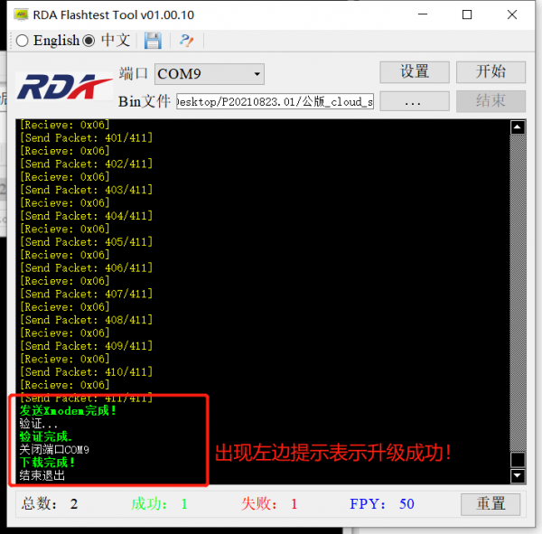 至此,通过串口升级固件全部完成。这里需要注意的是,如果在在点击打开烧写时,软件没有任何反正,可以再次关闭界面,然后再开机,反复直至软件界面有变化。如果还是没有反应,则需要查看线材与PCB板连接是否完好。