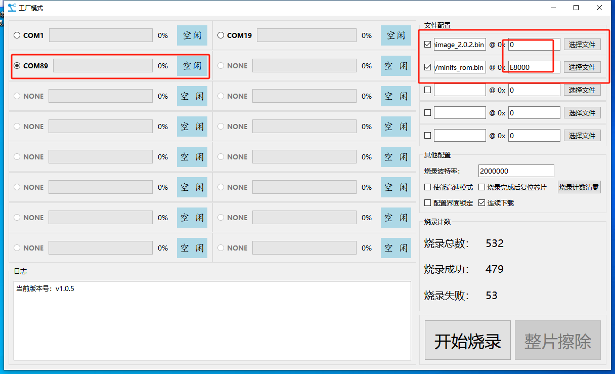 2. 在工具界面,选择对应串口后,在右边文件配置区域,选中所需要升级的固件或内置网页。(注意:网页文件地址:E8000,固件地址:0)如图所示