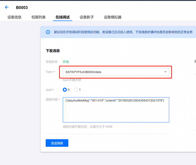 在设备查看界面,进入“在线调试”,选择对应的topic,点击后面的“发布消息”按钮,把需要发送的数据内容,填入到弹出框中,点击确定,就可以把数据推送到对应的设备。