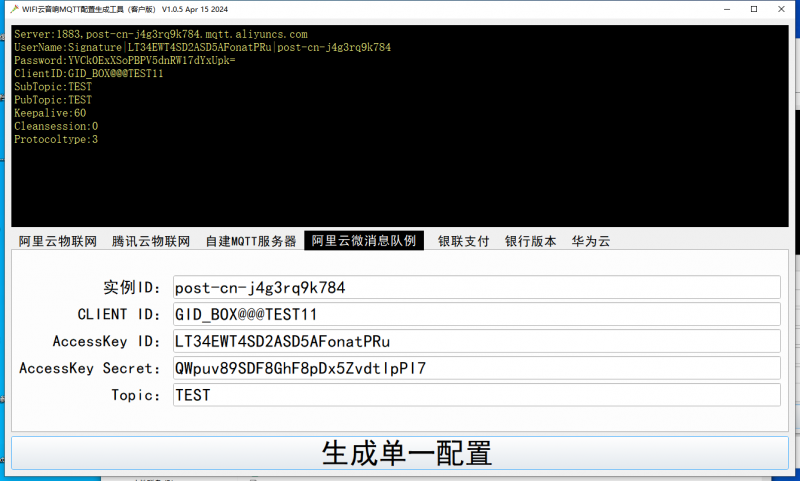 打开“MQTTConfigTools(WIFI客户版).exe”,将服务器参数如下图所示对应填入工具中。
