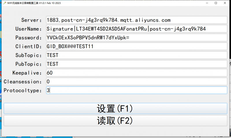 下载CloudSpeakConfig.rar应用程序,将MQTT相关参数设置入设备中,